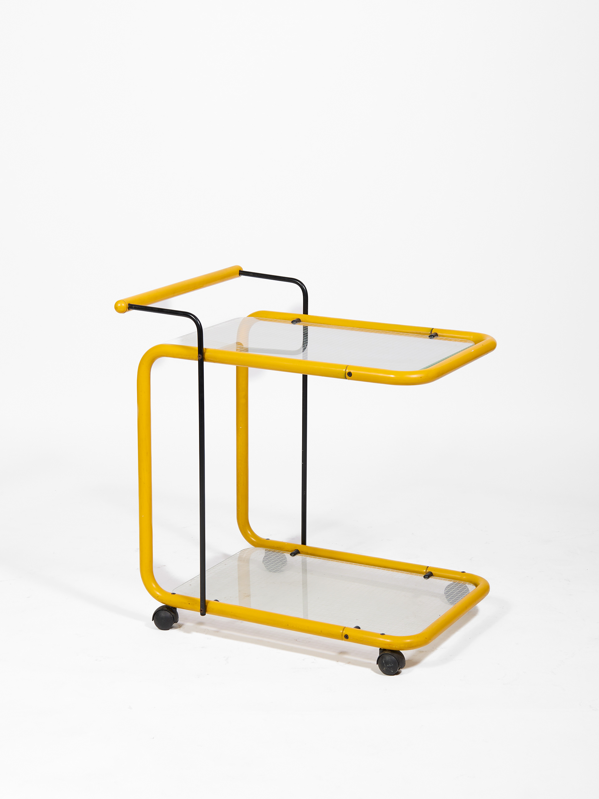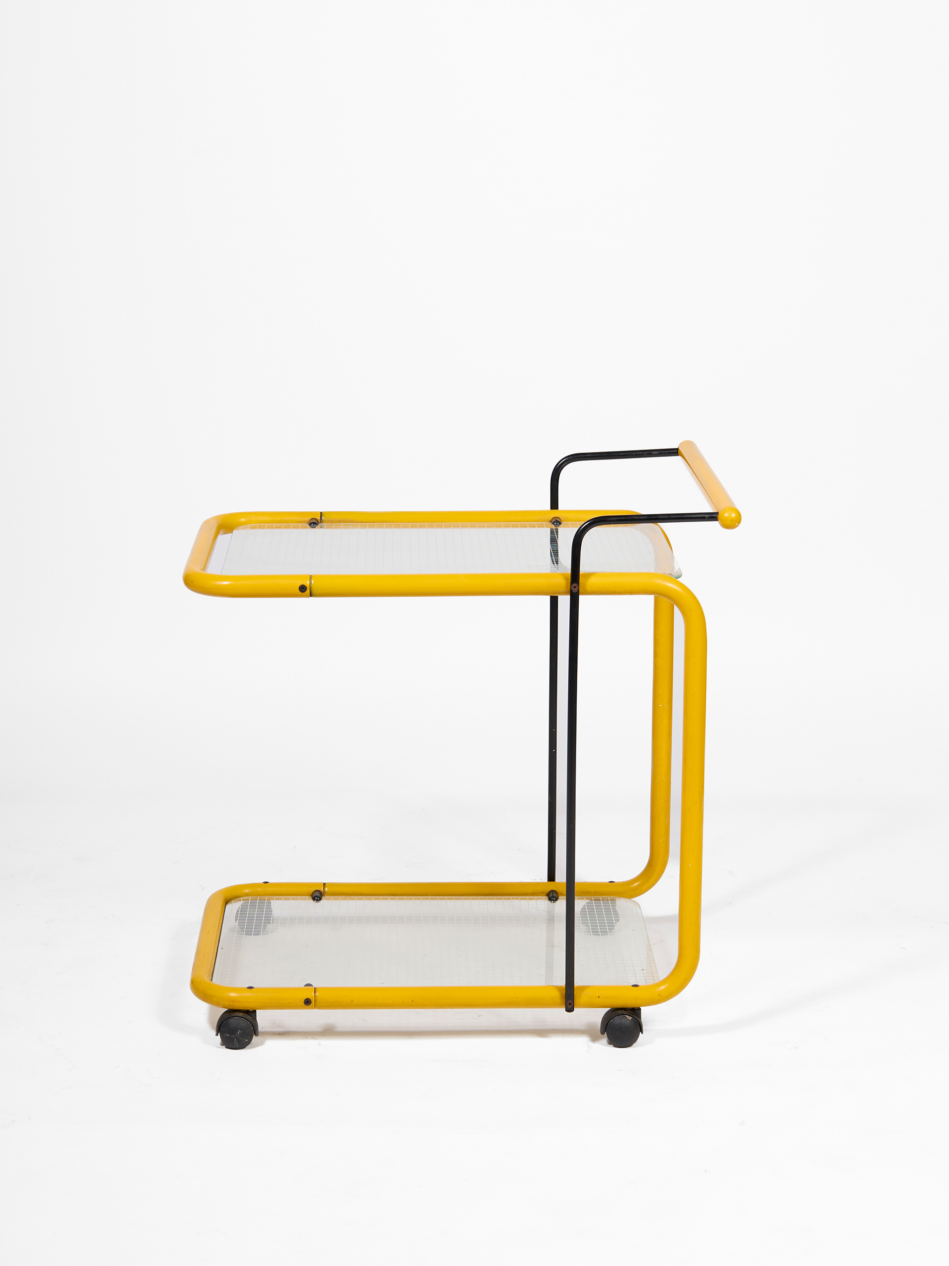 Carrello postmoderno giallo in metallo e vetro