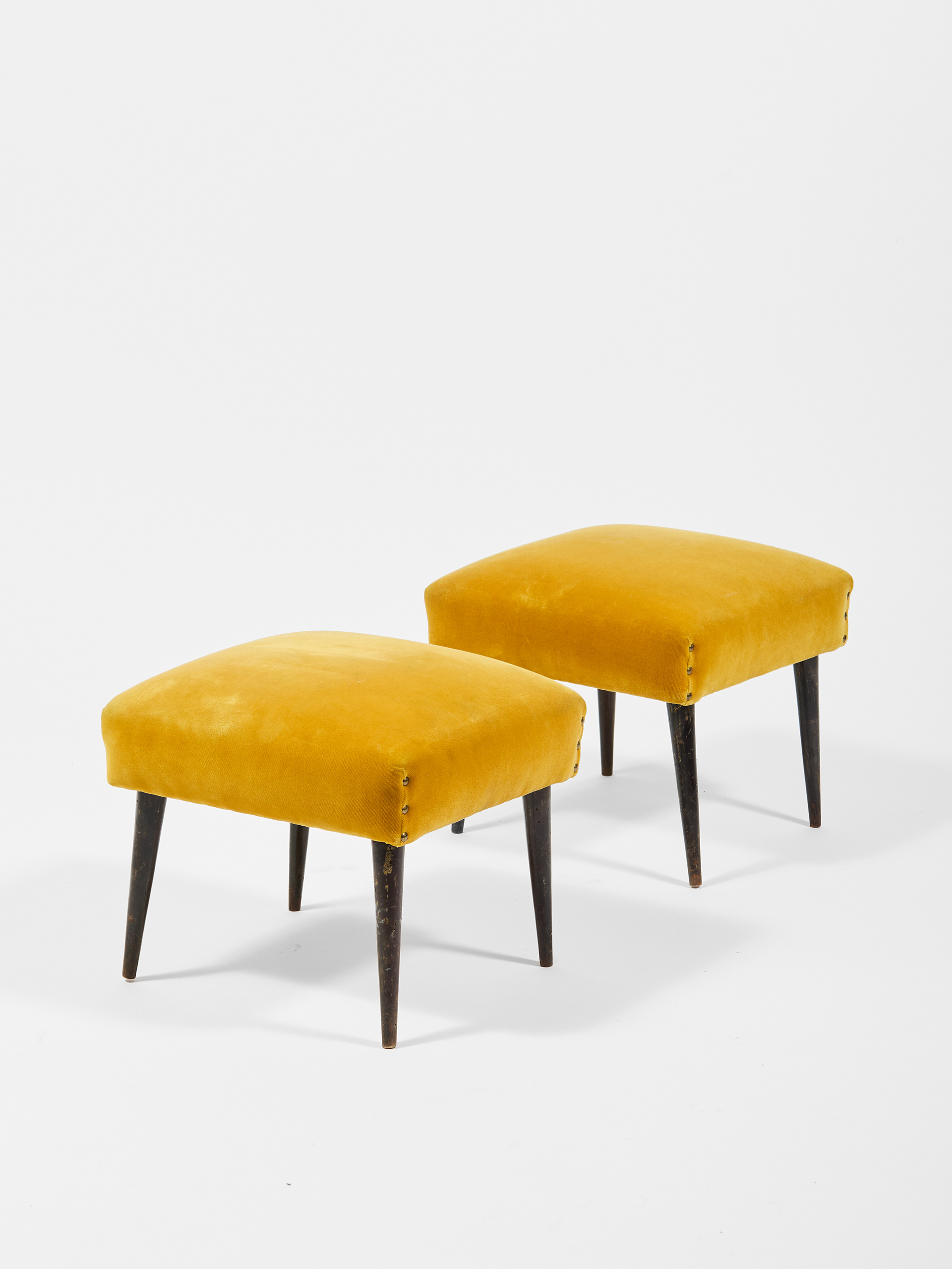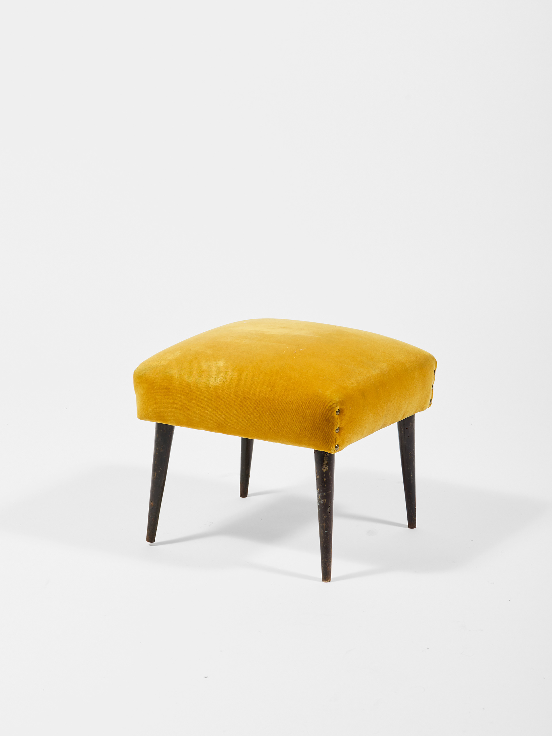 Imbottitura con rivestimento in velluto giallo e gambe in legno.