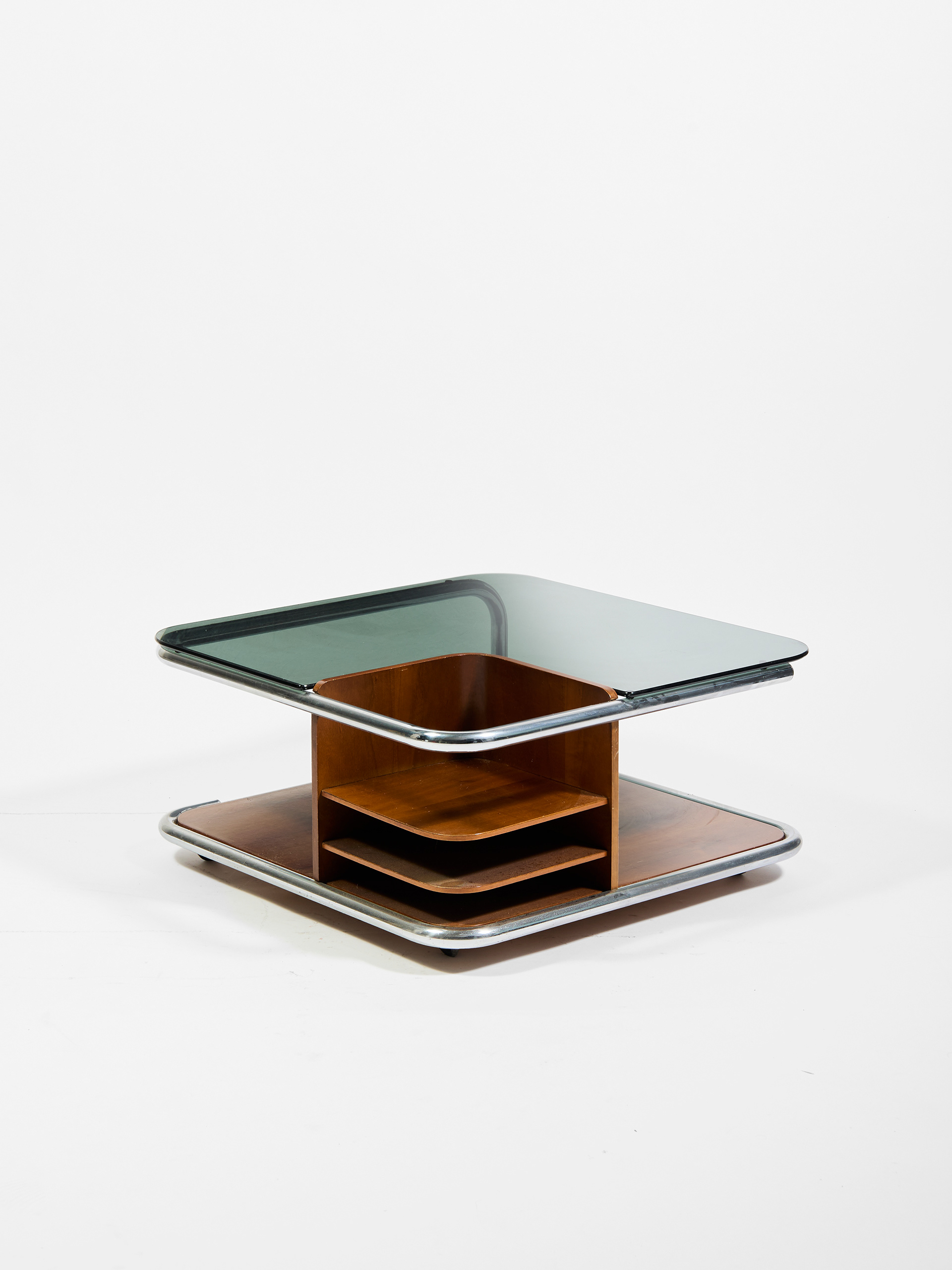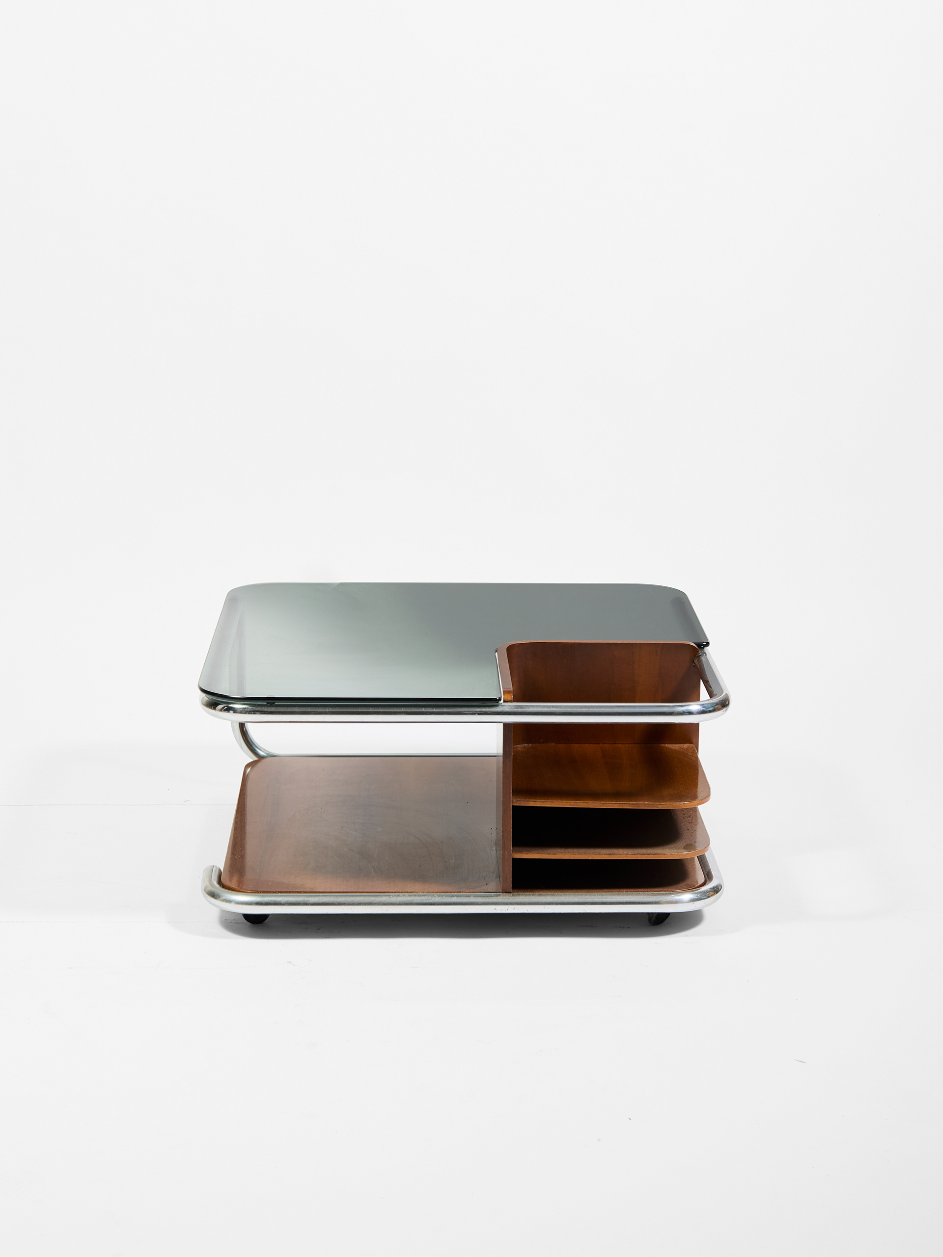 Tavolino anni 70 in noce, vetro fumé e metallo cromato